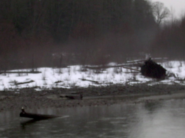 There are two eagles in this picture. One is on the log in the water, the other is on the large tree stump on the shore, to the right of the river log. The white stuff is snow.
