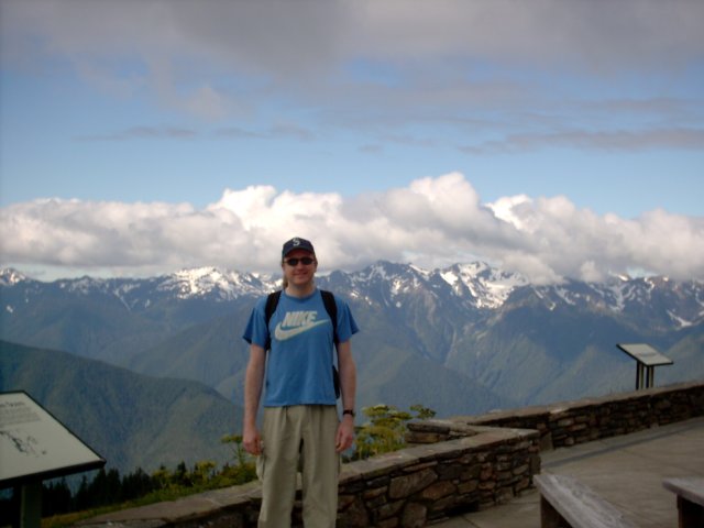 Mt. Olympus is the tallest peak of the Olympic range at 7980 ft. It is located about 15 miles south of the visitor’s center (that’s strictly a guess from eye-balling my map). There are some easy trails at Hurricane Ridge that allow you to see the mountain range to the south, but also Vancouver Island to the north.