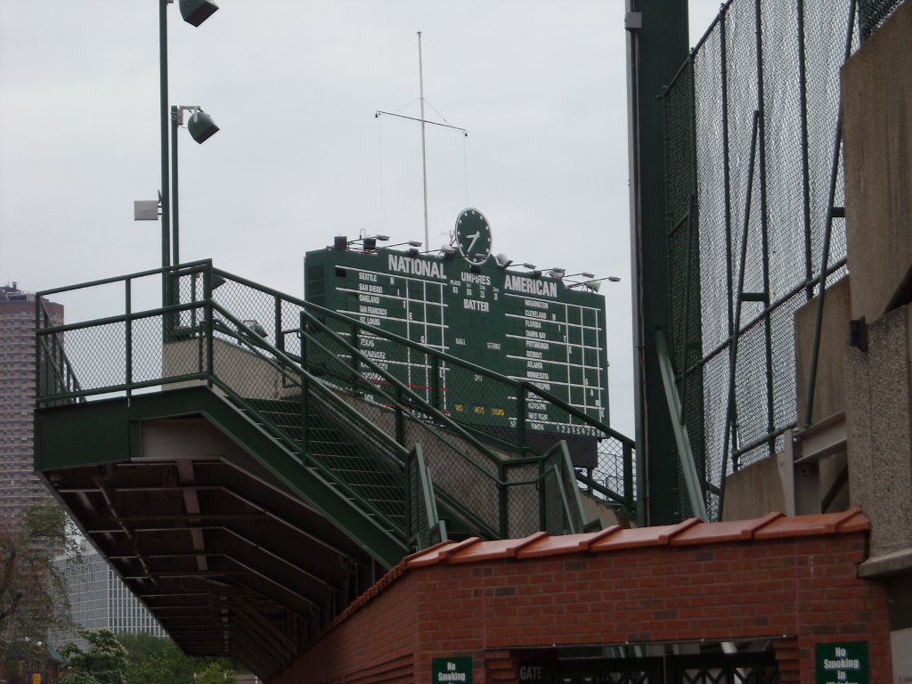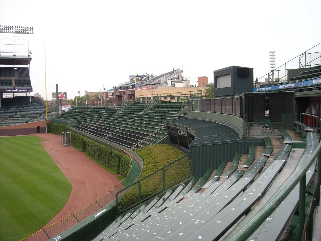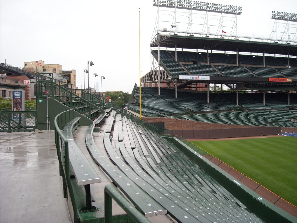 Outside on Waveland looking at the remodeled bleachers, which now overhang the sidewalk.