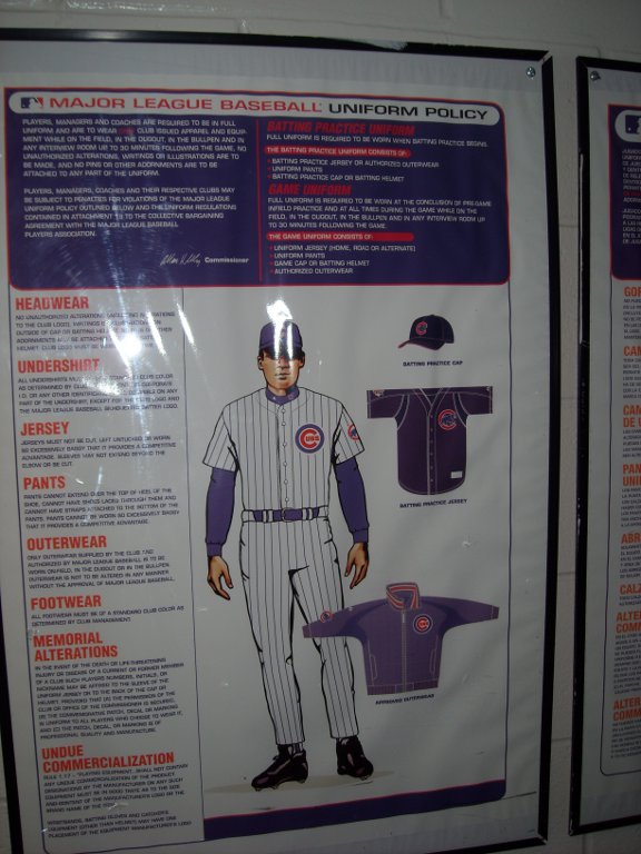 In the clubhouse, they had framed jerseys of the retired Cubs’ numbers. There was also a poster with the rules about how to wear your uniform.