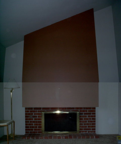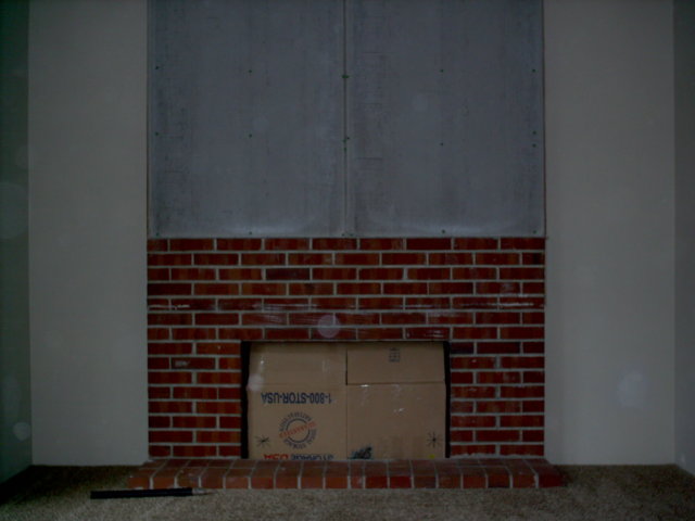 Before – The old fire hazard – I mean fireplace – had a wood framed, drywall covered box that protruded 10 inches from the wall. It was 6 inches above the opening of the fireplace. According to all the codes that I’ve seen, for every inch out, you need to be 8 inches up. 10 inches means 80 inches, not 6.