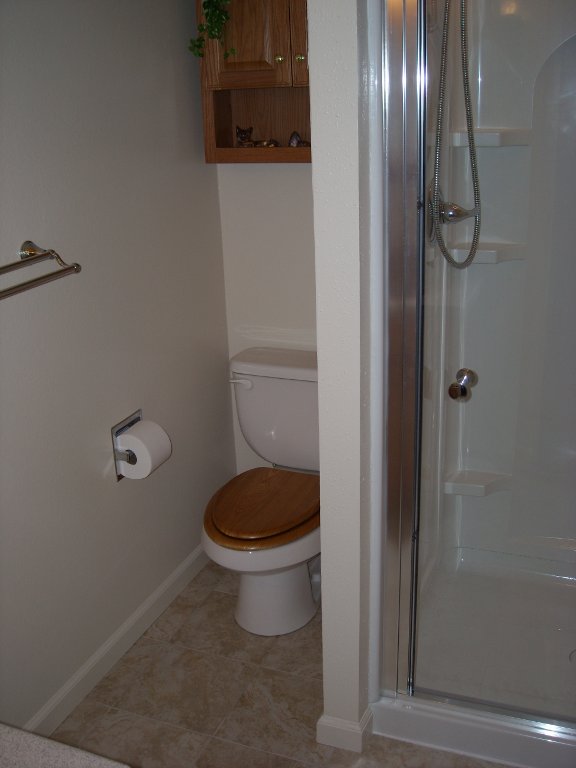 The new shower is acrylic. Sure, it doesn’t look as fancy as a tiled shower, but it is easy to clean. It has no caulk except by the door and no grout to clean. 3 snap together walls that are designed to keep the water inside the shower. The underfloor heating system is by SunTouch. It is a wire that is embedded in a mesh that you put under the tile in the mortar. The only evidence is the thermostat on the wall.