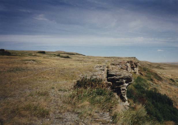Not far away was the Head-Smashed-In Buffalo jump. While now at a height of 10 meters, dense bone deposits 12 meters deep below the cliff would indicate that the drop was more than double this 6000 years ago when buffalo jumping began. Basically, the native people herded buffalo over the cliff as a way to hunt more efficiently.
