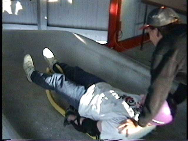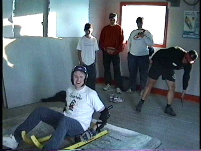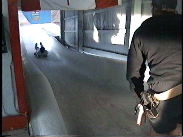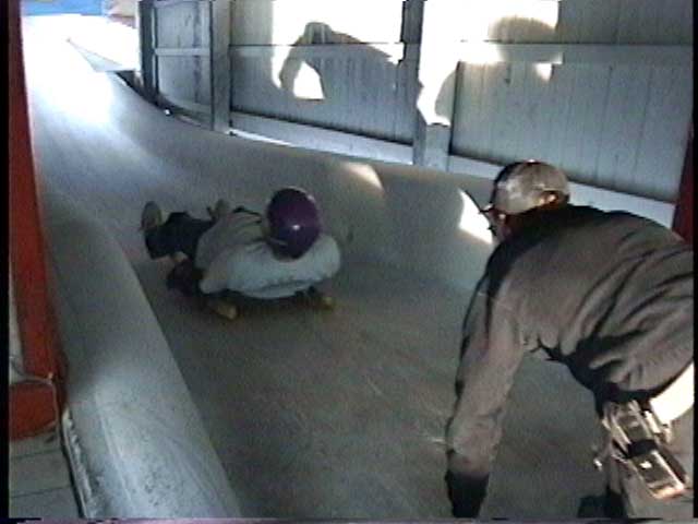 Then there’s the luge. For $13 (Canadian & in 1997), and after you sign a waiver, you can risk your life and limb by sliding down an icy track on a tiny little sled. This has got to be the most fun I’ve had on a vacation ever. It was so much fun that when I got to the bottom, I went right back up the hill to plunk down another $13 to go again. Highly recommended if you are not a wiggler. If you can’t lay still, you will probably wipe out. It didn’t take much effort to move the sled left and right. Move too far in one direction and you’ll flip. It was so much fun that I could not help but have a huge smile and laugh out loud all the way down the hill. Denise did not do the luge. Denise is a wiggler! As you can see in the pictures, you don’t have to push yourself off. Someone (who works there) pushes you.