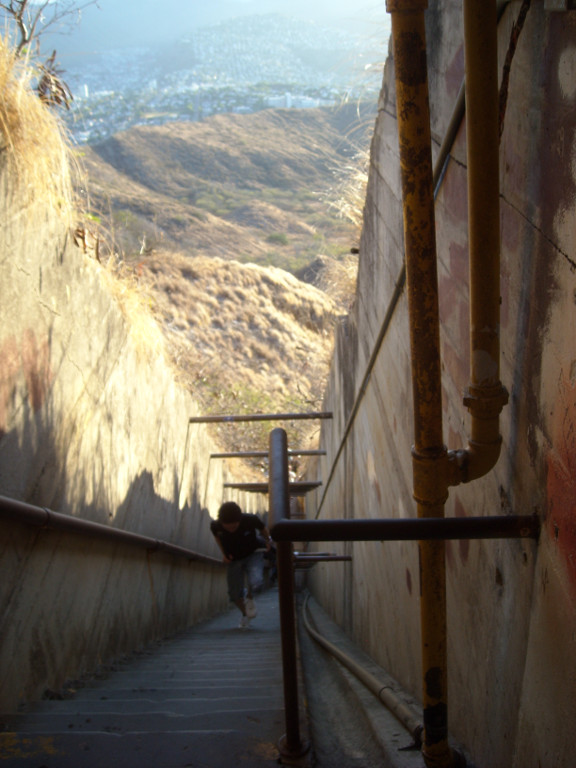 We got up at 4:30am one day so we could hike to the top of Diamond Head. It was very warm in Honolulu during the day, mid to upper 80’s, and the overnight lows were only in the low to mid 70s. So we wanted to get an early start. The volcanic tuff cone (yeah, it’s a volcano, dormant for 150,000 years) is open for hiking beginning at 6am. We took the bus to get there, and arrived shortly before 6:00. The hike is fairly steep, and the worst part is near the end, when you have to climb a lot of stairs.