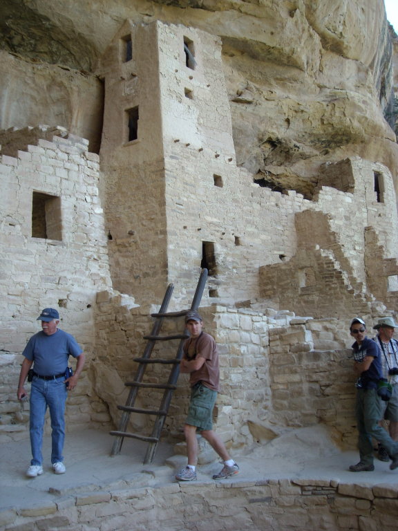 Getting into Cliff Palace requires climbing down the uneven stairs carved into the cliff. The stairs were built in the ’30s, before anyone thought of making all the stairs the same height, width and depth. The new OSHA rules state that visitors can only go up ladders and down stairs. No going down a ladder, or I guess they throw you in jail.