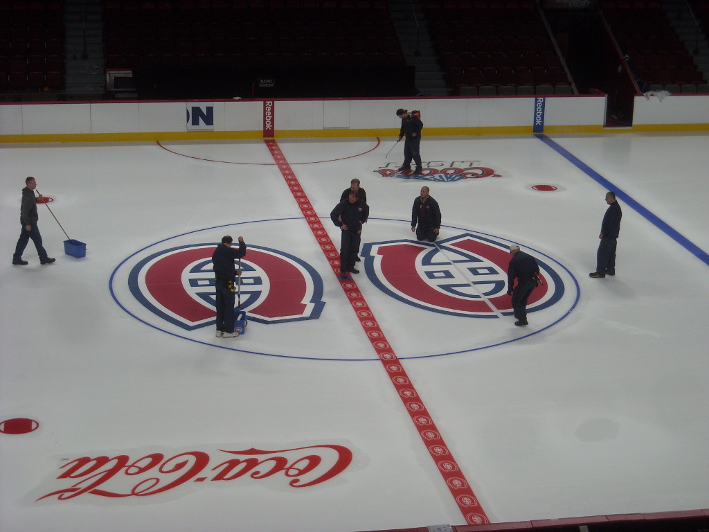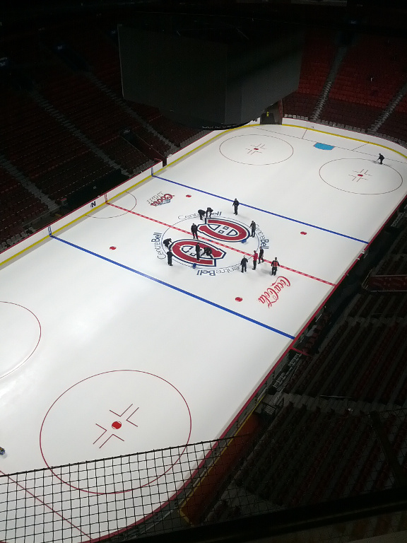 After lunch at Noobox (a noodle restaurant), we went on a tour of the Centre Bell, home of the Montreal Canadiens. It takes 7 days to prepare the ice for hockey. There are five layers of ice, and today they were putting down the decals on top of layer 3.