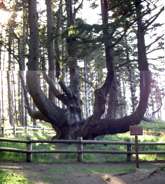 Our morning started with a drive around the cape to see more water, sand and rocks. I had taken over 200 pictures, and looking at them later, it was a challenge to determine exactly where some were taken. We drove through Cape Meares, Oceanside and Netarts. Off the coast of Oceanside is 3 Arches Rock, which you can see better from the Cape Meares Lighthouse. Also near the lighthouse is the octopus tree. This tree was formed by the strong coastal winds. Each of the tree limbs are 12 feet around and extend from the main trunk by 30 feet. The base of the tree has a circumference of 50 feet.