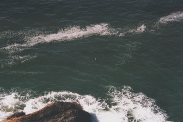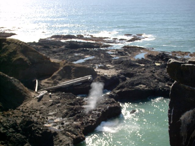 This picture may be from Cape Perpetua. Like I said earlier, all this water, sand and rock starts to look the same after a while. There was a hole in one of the rocks, so when a wave comes in, it blows the water straight up.