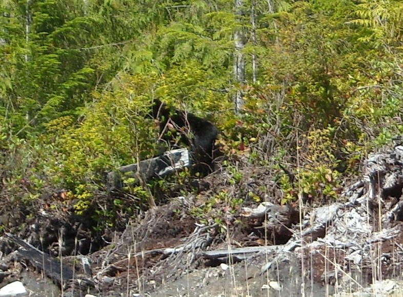 This black bear was at the side of the road as we were driving, and he scampered into the brush. You can see the back half of the bear.